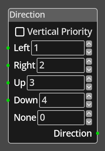 - An integer output port, one of the four direction parameter values will be output on this port depending on the input data and the Vertical Priority parameter.